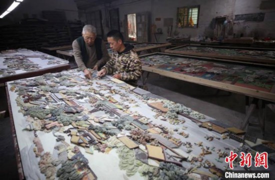 在瑞安市陶山鎮(zhèn)霞林村的陶峰工藝雕刻廠,彩石鑲嵌藝人李成者等人完成了彩石鑲嵌作品《清明上河圖》其中一部分。各色各樣的彩石流光溢彩,在工藝師傅的手中雕刻或拼接成一座座富麗堂皇的院落建筑,街道上絡(luò)繹不絕的車輛,集市上熙熙攘攘的人群……人物、場景栩栩如生,讓人嘆為觀止。