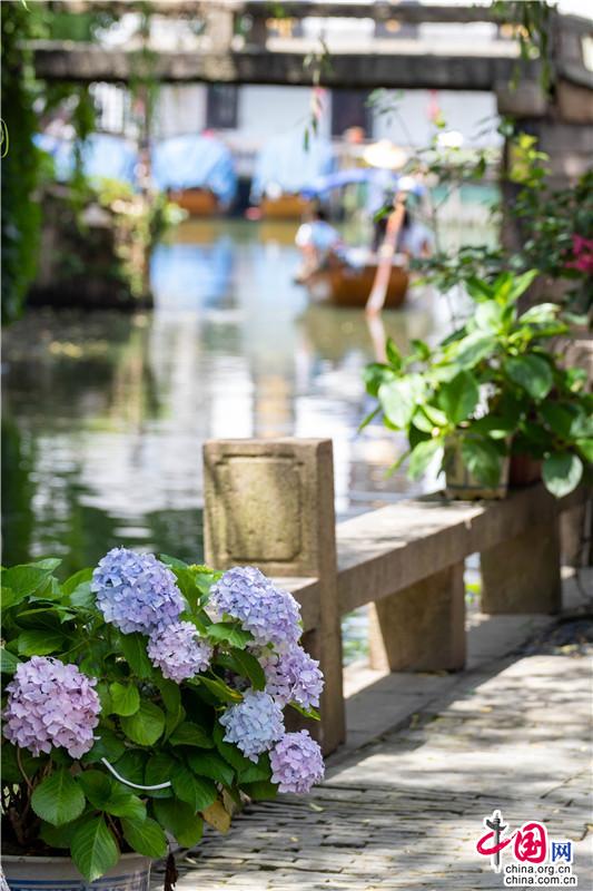花團錦簇一詞大約是為繡球量身定制,微風一曳,波光親吻一曳。藍紫開遍,彌漫的淡淡花香讓春天的信使忍不住沉溺其中,周莊的浪漫大抵關乎世間一切。
