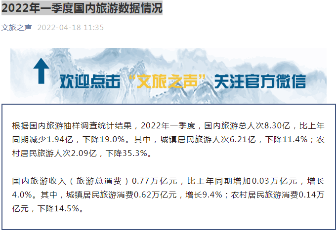 今天,文化和旅游部公布了2022年一季度國(guó)內(nèi)旅游數(shù)據(jù)情況。統(tǒng)計(jì)數(shù)據(jù)顯示,2022年一季度,國(guó)內(nèi)旅游總?cè)舜?.30億,比上年同期減少1.94億,下降19.0%。其中,城鎮(zhèn)居民旅游人次6.21億,下降11.4%;農(nóng)村居民旅游人次2.09億,下降35.3%。