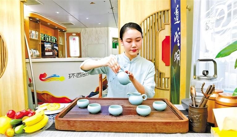 這趟列車由6節(jié)軟臥車廂、1節(jié)餐車、1節(jié)休閑娛樂功能車組成,車體內(nèi)外隨處可見平?jīng)鑫幕糜卧亍S浾咴谲噹麅?nèi)看到,崇信龍泉寺、華亭安口窯古村落、靜寧仙人峽……每一間軟臥門上都是絕美的平?jīng)鲲L光大片,整個車體儼然移動的“平?jīng)鑫穆谜桂^”,讓人“身未動,心已遠”。車體中部的功能車,更是顛覆了以往人們對火車的認知,麻將桌、功夫茶、全套的K歌設(shè)備,還有平?jīng)鎏厣穆蒙唐?、農(nóng)特產(chǎn)品展銷區(qū),平?jīng)鑫穆脮営[區(qū)、平?jīng)鑫幕黝}報刊欄,足以打發(fā)游客在旅途中的無聊時光。餐車也極富特色,車廂頂部裝飾有色彩豐富的藻井圖案,飛天仙子衣袂飄飄、環(huán)繞四周。“在這樣的餐車上吃飯,吃的那是品位。”一位乘客開心地和同行的伙伴說著。62歲的張女士一到平?jīng)鼍兔Σ坏亟o女兒發(fā)微信,“火車上住得舒適,服務(wù)好,環(huán)西部火車游·崆峒號很超值!”