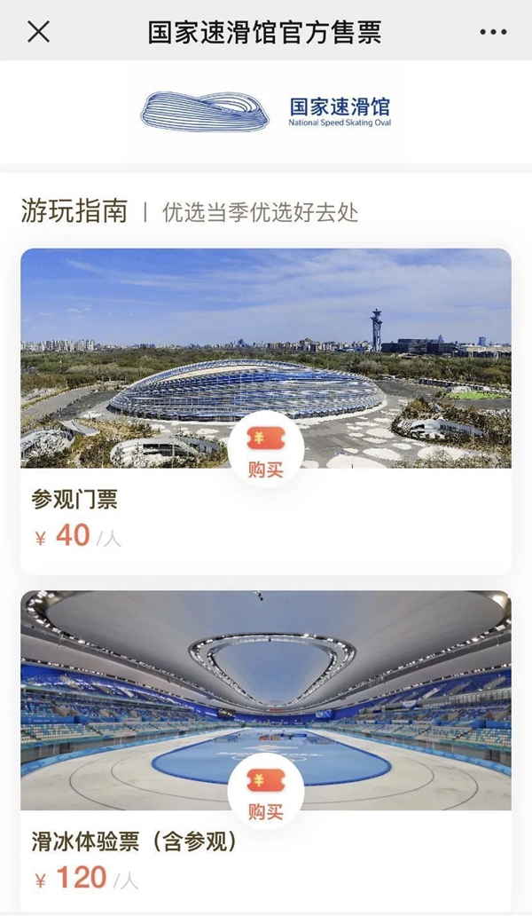 來這里參觀可以通過微信關(guān)注“國(guó)家速滑館”公眾號(hào)進(jìn)行票務(wù)預(yù)約。參觀門票40元每人次。參觀加上冰的套票120元每人次。根據(jù)游客需求,也可以現(xiàn)場(chǎng)購買80元每人次的滑冰體驗(yàn)票,其中包含了90分鐘的滑冰體驗(yàn)和一套冰鞋一套護(hù)具。