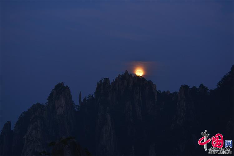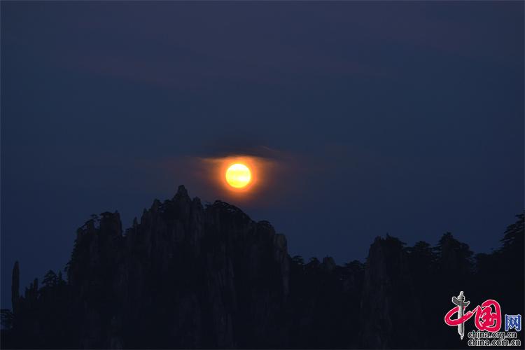 9月10日,中秋之夜,7點左右月亮如約而至,躍出地平線,穿過群峰峻嶺,露出了它靚麗的臉龐。剛出的時候,月亮和初升的太一樣是帶紅色的,隨著慢慢的升起越來越明亮,這時的黃山在月光照射下變得很清新。(姚育青)
