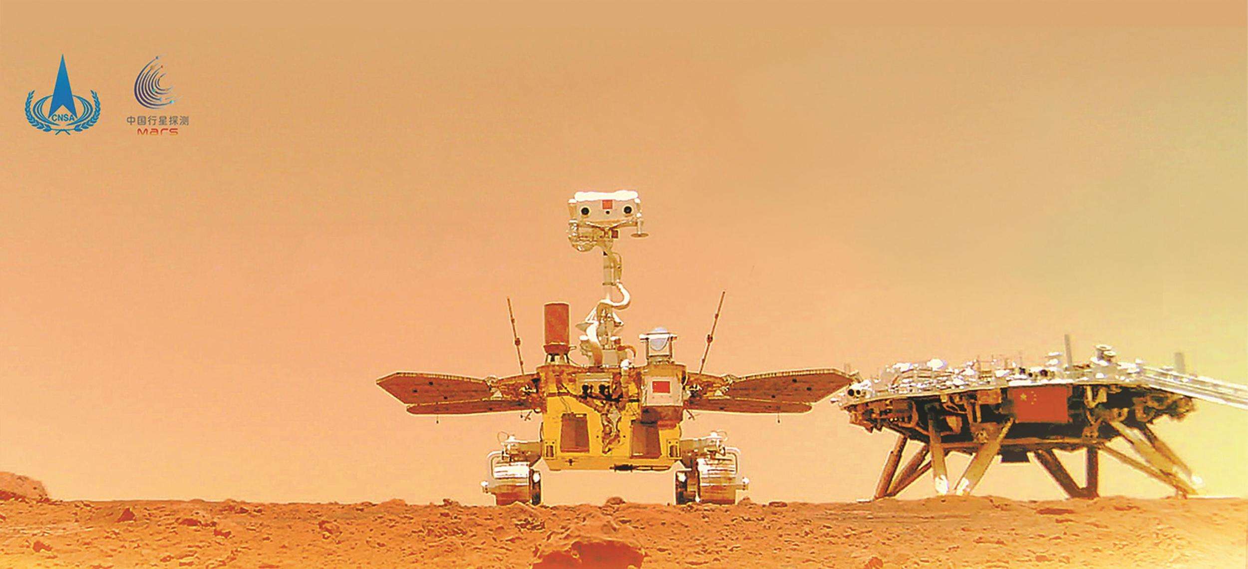 中國(guó)首次火星探測(cè)天問一號(hào)任務(wù)“祝融號(hào)”火星車與著陸器合影。國(guó)家航天局供圖