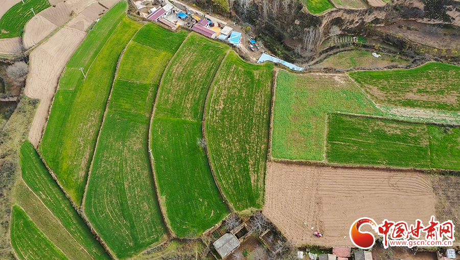 初冬時節(jié),平?jīng)鍪谐缧趴h錦屏鎮(zhèn)農(nóng)田里冬小麥長勢喜人,從空中俯瞰,給田野鋪上了綠色的地毯。