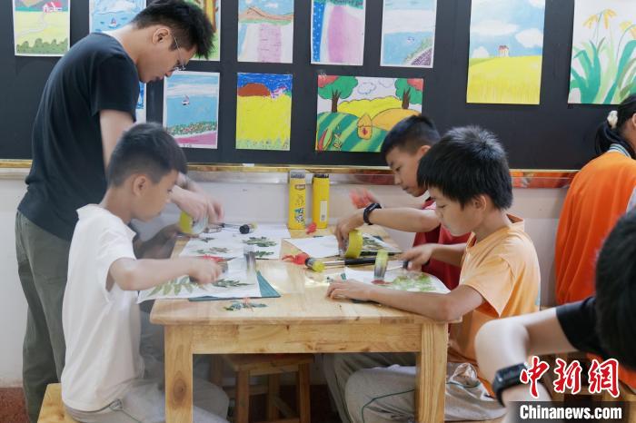 距離村口不遠(yuǎn)處的六禾畫(huà)社中,傳來(lái)一陣“咚咚”的敲擊聲。屋內(nèi),十幾名孩童手拿小錘子,在白色卡紙上拓印葉片的形狀。