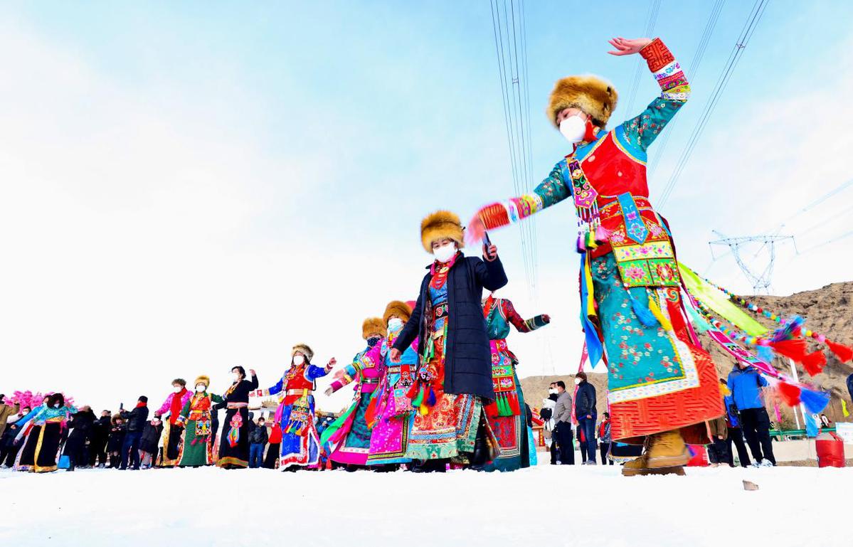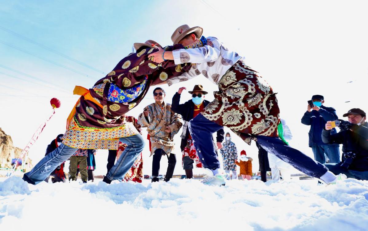 當(dāng)日,“相約文殊山樂享冰雪趣”,藏族群眾在冰雪運動場上進(jìn)行雪地鍋莊舞、頂杠子、拔棍、拉爬牛、戶外徒步、雪地摔跤、雪圈滑行追逐、滑冰、電商直播等多項比賽,吸引了周邊群眾和甘肅酒泉、嘉峪關(guān)等地的萬名游客前來參觀游覽和參與比賽。
