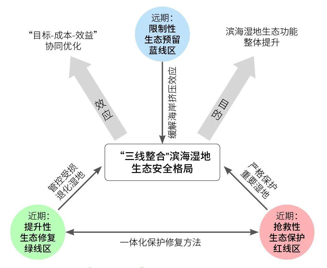 其概念構(gòu)架強調(diào)一體化整合保護與修復格局,同時兼顧濱海濕地應對海平面上升的長期適應性,構(gòu)建對濱海生態(tài)系統(tǒng)整體功能提升最惠益的生態(tài)安全格局,包括:近期搶救性生態(tài)保護紅線區(qū)與提升性生態(tài)修復綠線區(qū),以及遠期限制性生態(tài)預留藍線區(qū),由此構(gòu)建應對圍墾開發(fā)和適應未來海平面上升情形下,基于“三線整合”的濱海濕地生態(tài)安全格局(圖1)。