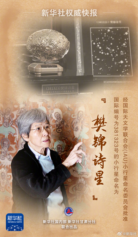 7月10日,樊錦詩從事敦煌文物工作60年座談會在敦煌舉行。會上正式命名了編號381323小行星為#樊錦詩星#。繼向北京大學(xué)捐資1000萬元支持敦煌學(xué)研究后,樊錦詩再向中國敦煌石窟保護研究基金會捐資1000萬元,用于敦煌文物事業(yè)發(fā)展和急需人才培養(yǎng)。捐款來自樊錦詩所獲獎金及個人積蓄。(記者:張玉潔 施雨岑 張智敏)
