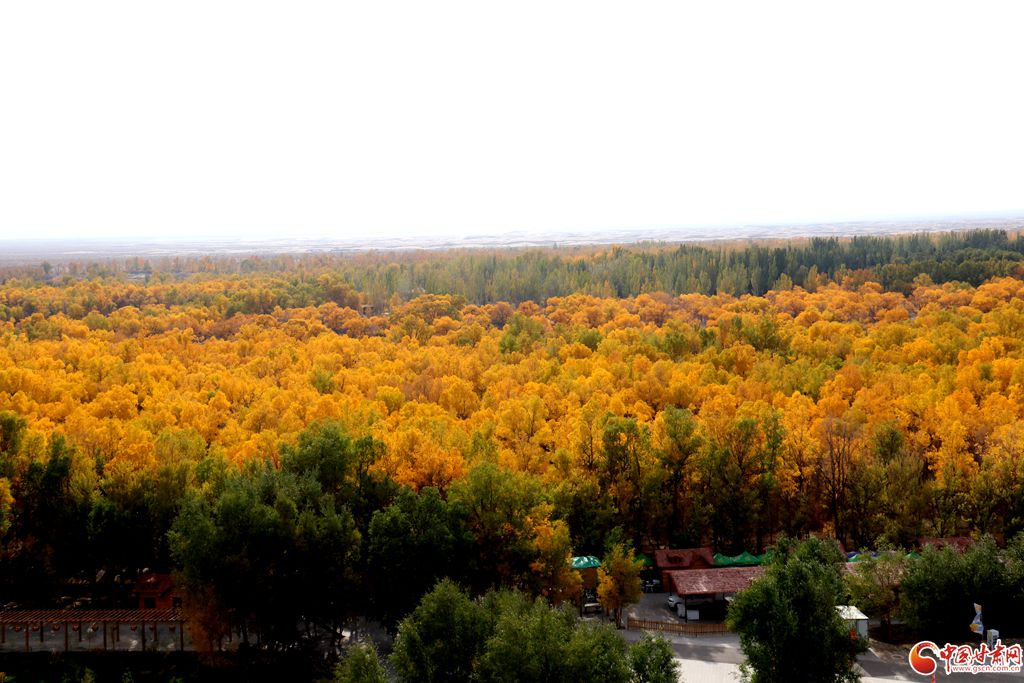 秋高氣爽,金塔沙漠胡楊林景區(qū)進(jìn)入最佳觀賞期,大片胡楊由翠綠轉(zhuǎn)成金黃,與湛藍(lán)的天空交相輝映。在蒼茫大漠之上,萬畝胡楊層林盡染,形態(tài)各異的胡楊巍然屹立,依水而生。