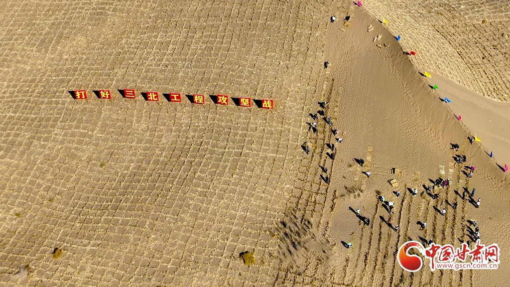 10月31日,河西走廊——塔克拉瑪干沙漠邊緣阻擊戰(zhàn)張掖區(qū)域戰(zhàn)役正式啟動,張掖市千名市民來到高臺縣巴丹吉林沙漠南緣西沙窩風(fēng)沙口治理區(qū)共同義務(wù)壓沙障。