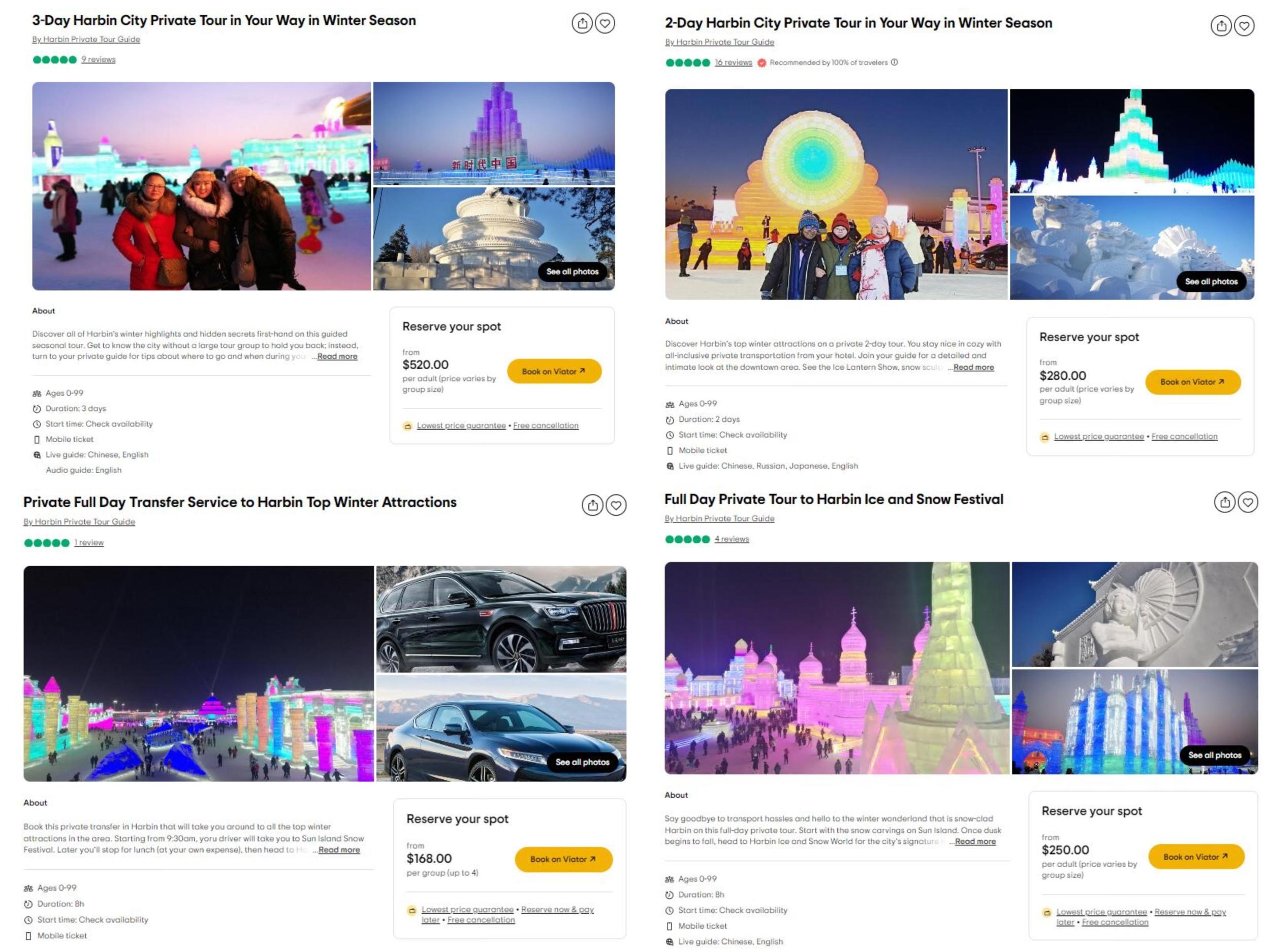 中新財經(jīng)查看Tripadvisor網(wǎng)站發(fā)現(xiàn),該平臺上有數(shù)十個關(guān)于哈爾濱旅游的服務。其中,“哈爾濱市冬季私人三日游”每位成人收費520美元起,“哈爾濱市冬季私人兩日游”每位成人收費280美元起,這兩個服務的費用不包括門票,包括私人導游服務、交通費(私人汽車或公交車/出租車)、酒店接送;“哈爾濱冬季熱門景點私人全日接送”每團收費168美元起(最多4人),費用不包括門票等,包括私人汽車、私人司機服務、燃油附加費。