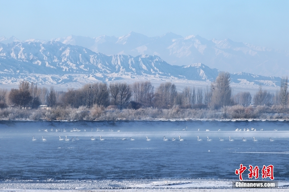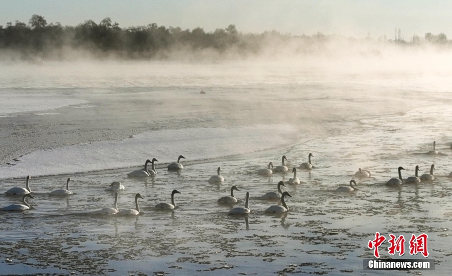 1月21日清晨,甘肅張掖市黑河國(guó)家級(jí)自然保護(hù)區(qū),受低溫影響,黑河水面霧氣氤氳縹緲,天鵝在水中暢游,野鴨等候鳥(niǎo)在空中飛舞,宛如一幅水墨生態(tài)畫(huà)卷。圖/CNSphoto 成 林 攝