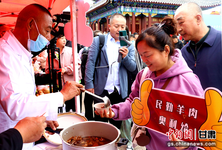 3月下旬,民勤縣在天水啟漢樓廣場(chǎng)舉行推介會(huì),宣傳本地旅游資源和農(nóng)特優(yōu)產(chǎn)品。圖為游客一邊品嘗民勤羊肉,一邊聆聽(tīng)美食背后的文化和故事。 周旦 攝