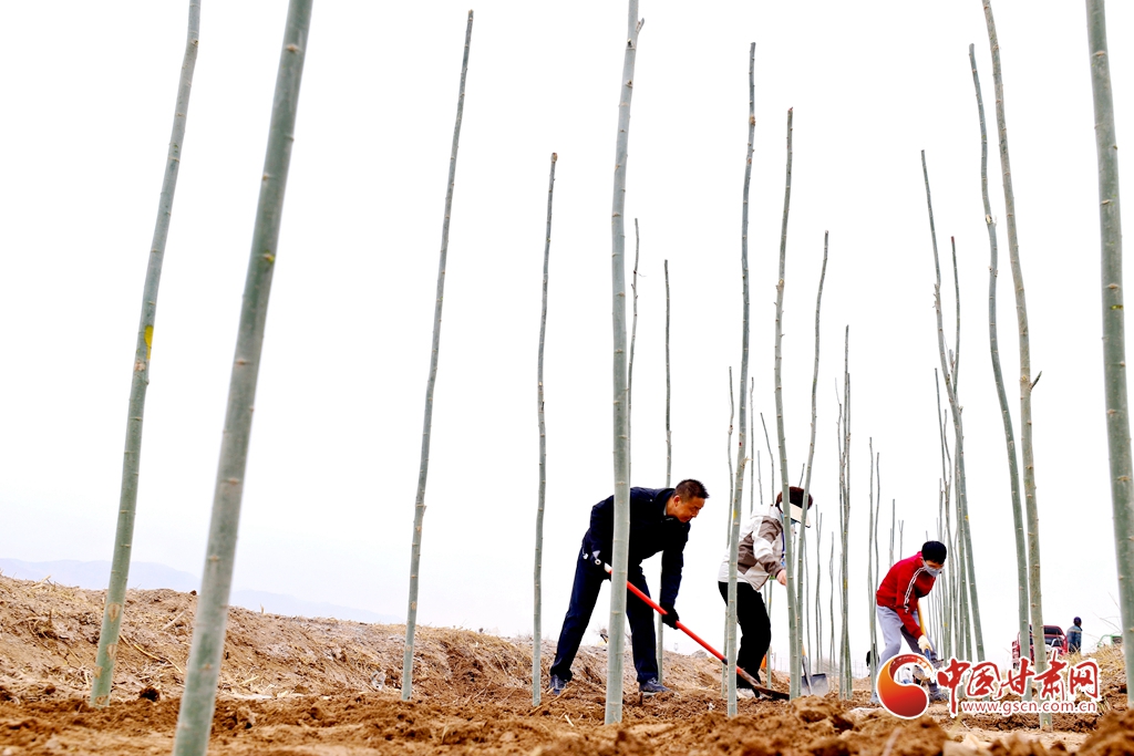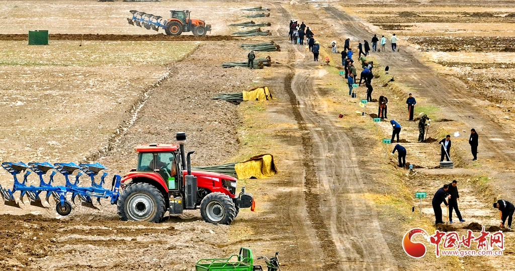 4月9日,甘肅省張掖市甘州區(qū)三閘鎮(zhèn)高寨村義務植樹基地上,千名當?shù)馗刹柯毠ず椭驹刚邆儞]鍬鏟土挖樹坑,掀起農田防護林建設和防沙治沙春季植樹造林熱潮。