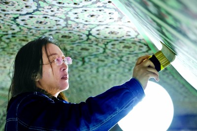 壁畫保護修復技師柴宗香在莫高窟第55窟修復壁畫。本報記者 劉宇航攝/光明圖片
