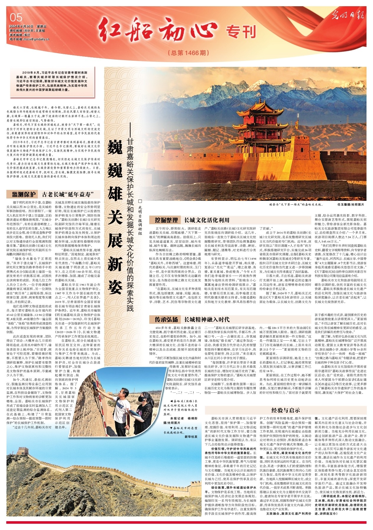 嘉峪關(guān)市牢記總書記殷殷囑托,切實擔(dān)起長城文化保護傳承時代責(zé)任,著力打造長城文化重要標(biāo)志地,長城文物遺產(chǎn)保護和長城文化價值挖掘成效顯著,長城資源優(yōu)勢和重要影響力持續(xù)放大。日前,本報調(diào)研組走進嘉峪關(guān)市,撫磚瓦,登長城,觸摸發(fā)展脈搏,探尋長城保護修繕、長城文化發(fā)掘弘揚的嘉峪關(guān)實踐。