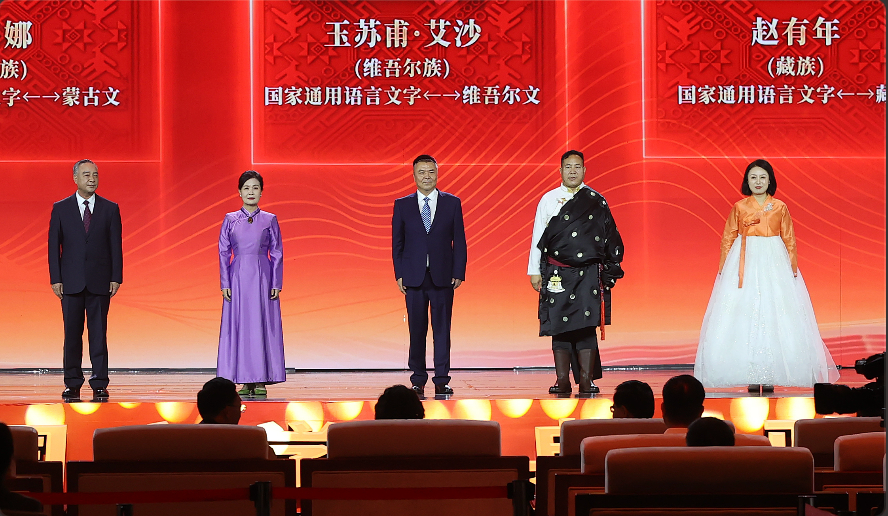 艾布、朵日娜、玉蘇甫·艾沙、趙有年、鄭風淑領取第十三屆全國少數(shù)民族文學創(chuàng)作駿馬獎翻譯獎。