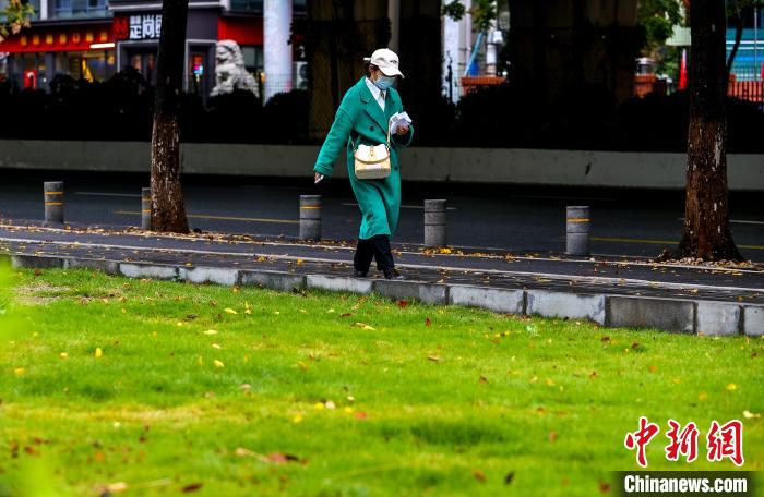 11月25日,市民在街頭出行。當(dāng)日,武漢受寒潮天氣影響,氣溫下降明顯。武漢市氣象臺24日18時27分發(fā)布寒潮藍色預(yù)警信號,受較強冷空氣影響,預(yù)計24日至26日,武漢最低氣溫降幅達7℃~9℃。中新社記者 張暢 攝