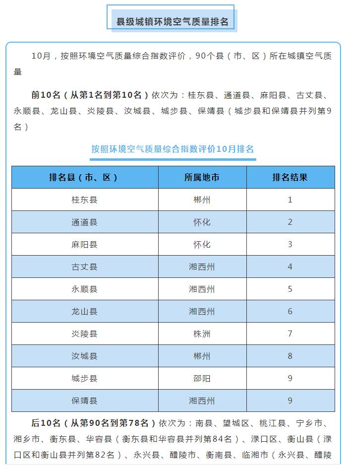 10月湖南環(huán)境空氣質(zhì)量:湘西張家界位居前茅