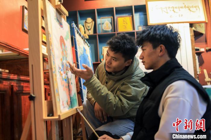 四川省甘孜藏族自治州理塘縣勒通古鎮(zhèn),是一個融合了特色傳統(tǒng)文化和現(xiàn)代創(chuàng)新的重要旅游目的地。近年來,理塘縣強化地域特色文化的保護,并引導(dǎo)當(dāng)?shù)鼐用翊蛟炝艘幌盗刑厣幕糜涡马椖?。唐卡、皮具工藝、藏文書法及土陶制作等傳統(tǒng)工藝項目不僅得到了保護,還吸引了大量游客前來觀賞和交流。圖為12月22日,在勒通古鎮(zhèn)的“唐卡館”,畫師昂旺登登(左)指導(dǎo)洛絨曲扎繪制唐卡。中新社記者 王磊 攝