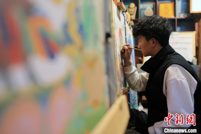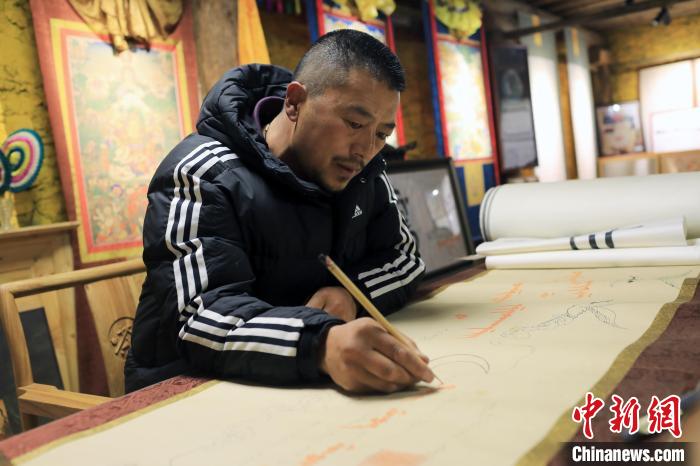 12月22日,在勒通古鎮(zhèn)的“唐卡館”,21歲的洛絨曲扎正在繪制唐卡。中新社記者 王磊 攝