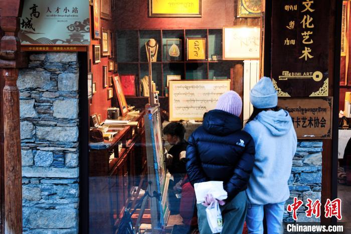 12月22日,在勒通古鎮(zhèn)的“唐卡館”,一位畫師繪制唐卡吸引游客駐足觀看。中新社記者 薛蒂 攝