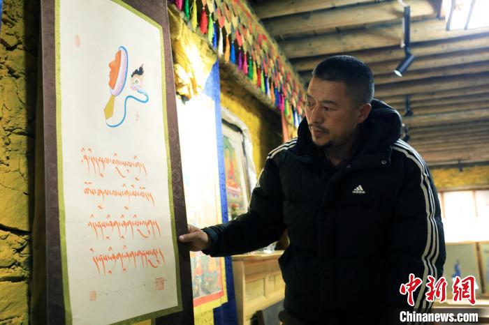 12月22日,藏文書法家昂旺曲批介紹自己的藏文書法作品。中新社記者 王磊 攝