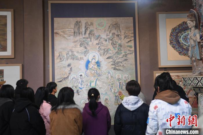 1月14日,甘肅省酒泉市,甘肅酒泉職業(yè)技術學院非物質文化遺產敦煌彩塑技藝傳習所內,學生們參觀敦煌壁畫作品。中新社記者 李亞龍 攝