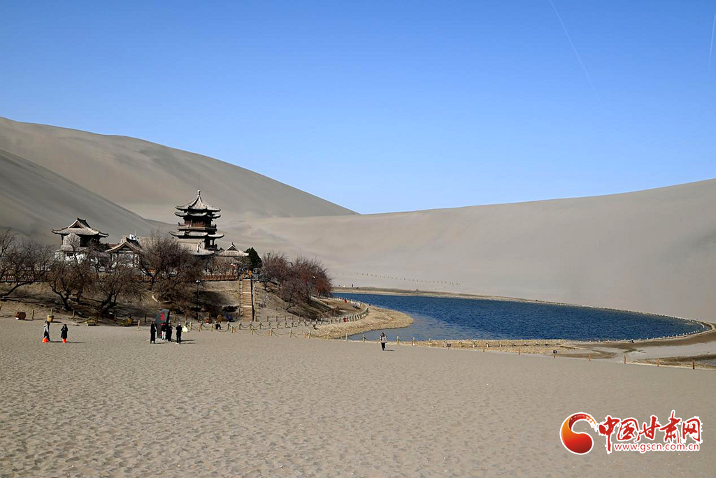 3月8日,隨著氣溫回暖,絲路明珠敦煌迎來(lái)早春勝景。鳴沙山環(huán)抱中的月牙泉冰雪消融,一泓碧水宛如翡翠鑲嵌在大漠之中,呈現(xiàn)出"沙水共生"的奇觀。
