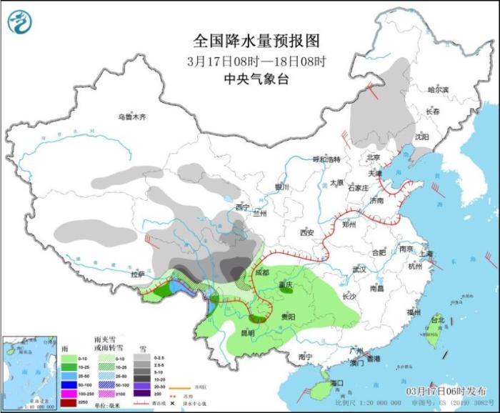 預(yù)計3月17日至23日,西藏東部、青海南部、川西高原、云南北部等地有小到中雪或雨夾雪,局地有大到暴雪;西藏東南部、四川盆地、貴州、云南中南部等地有小到中雨,局地有大雨。