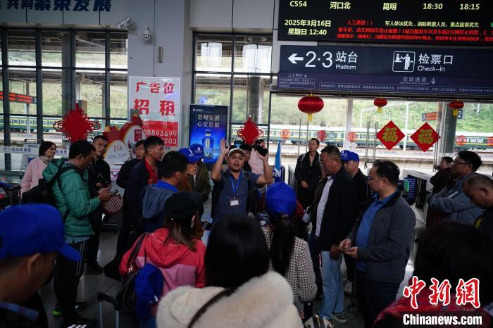 3月16日,云南省紅河州河口縣河口北站,一位導(dǎo)游組織越南旅游團(tuán)候車。中新社記者  劉冉陽  攝
