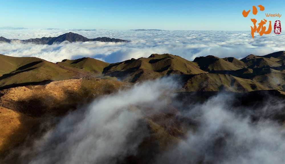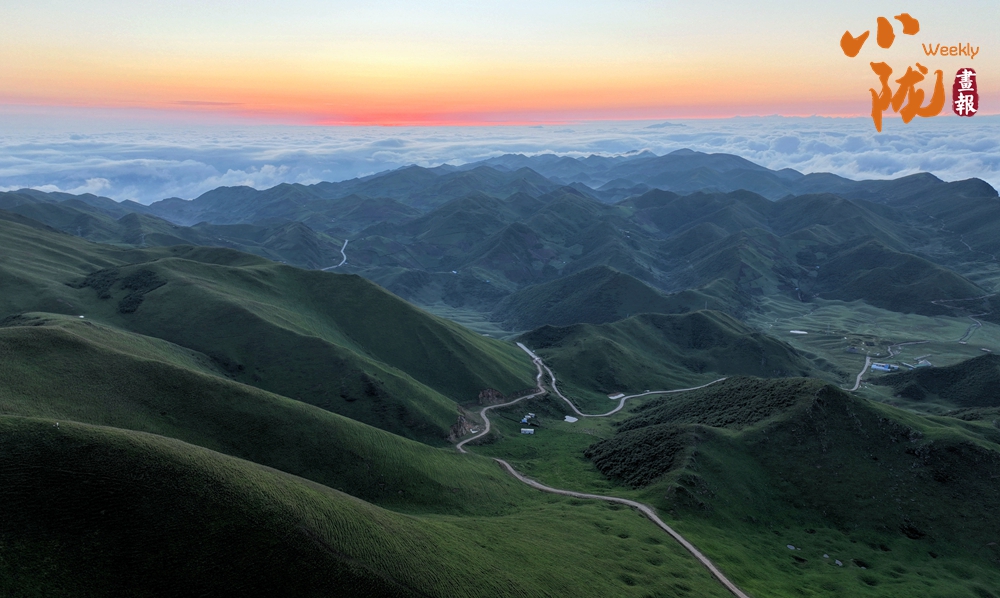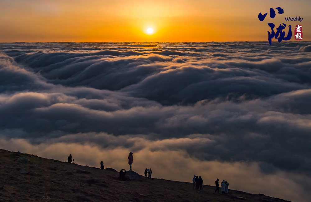 登頂望遠,千壩草原高山、草甸、草原相互交織,牛馬、羊群像一顆顆散落的珍珠點綴其中。茫茫云海鋪滿整個天際,翻涌的流云大河奔騰,蔚為壯觀,如臨于大海之濱。