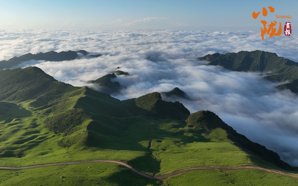 舉目望去,云海滾滾涌來,云霧隨著氣流上下涌動,如同一瀉千里的急流涌入溝壑,淹沒茫茫草原;俯視腳下,碧綠的草原一鋪萬頃,伸向遠方,輕輕隱入云際,極目遠望,心曠神怡……
