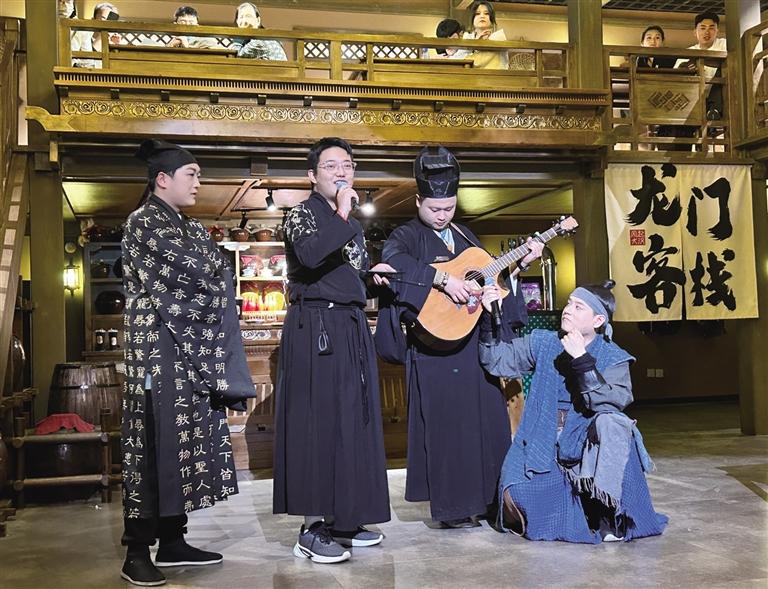 “諸位小友近來可好?”“好!”在街區(qū),NPC們與游客的互動(dòng)成為一大亮點(diǎn)。為了讓游客更好地沉浸其中,街區(qū)里的“蘭裳閣”專門提供服裝出租和妝造設(shè)計(jì)服務(wù)。游客們?cè)谶@里換上漢服、做好造型,“穿越”成古人與NPC們共同沉浸在這場(chǎng)歷史旅行中。張偉彥在“龍門客棧”工作快半年了,飾演店小二馬一刀。他對(duì)角色有著自己的理解:“導(dǎo)演讓我演店小二,大家印象里店小二都是機(jī)靈、腿腳快的。但我演的這個(gè)店小二帶著江湖氣息,他藏在龍門客棧,其實(shí)是個(gè)刀客,在這里打工是為了打探消息,畢竟龍門客??墒墙⒌木奂亍?rdquo;記者走在街區(qū),時(shí)不時(shí)就能看到他拿著草帽,熱情地招呼游客玩接帽子游戲。遇到靦腆不敢嘗試的游客,他也會(huì)不斷鼓勵(lì),有時(shí)候碰上外國游客,他還隨口說幾句英語與其互動(dòng)。