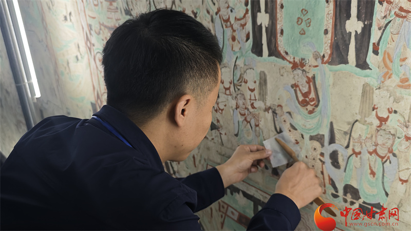 唐青松曾經(jīng)是一名莫高窟講解志愿者,在手電筒的柔和光源之下,他能更清楚看到壁畫里的病害,也更焦急如何更好保護(hù)壁畫,所以當(dāng)有機(jī)會成為壁畫修復(fù)師,他便拿起了保護(hù)工具,用五年時間傾心學(xué)習(xí),終于有了走進(jìn)洞窟修復(fù)壁畫的機(jī)會。
